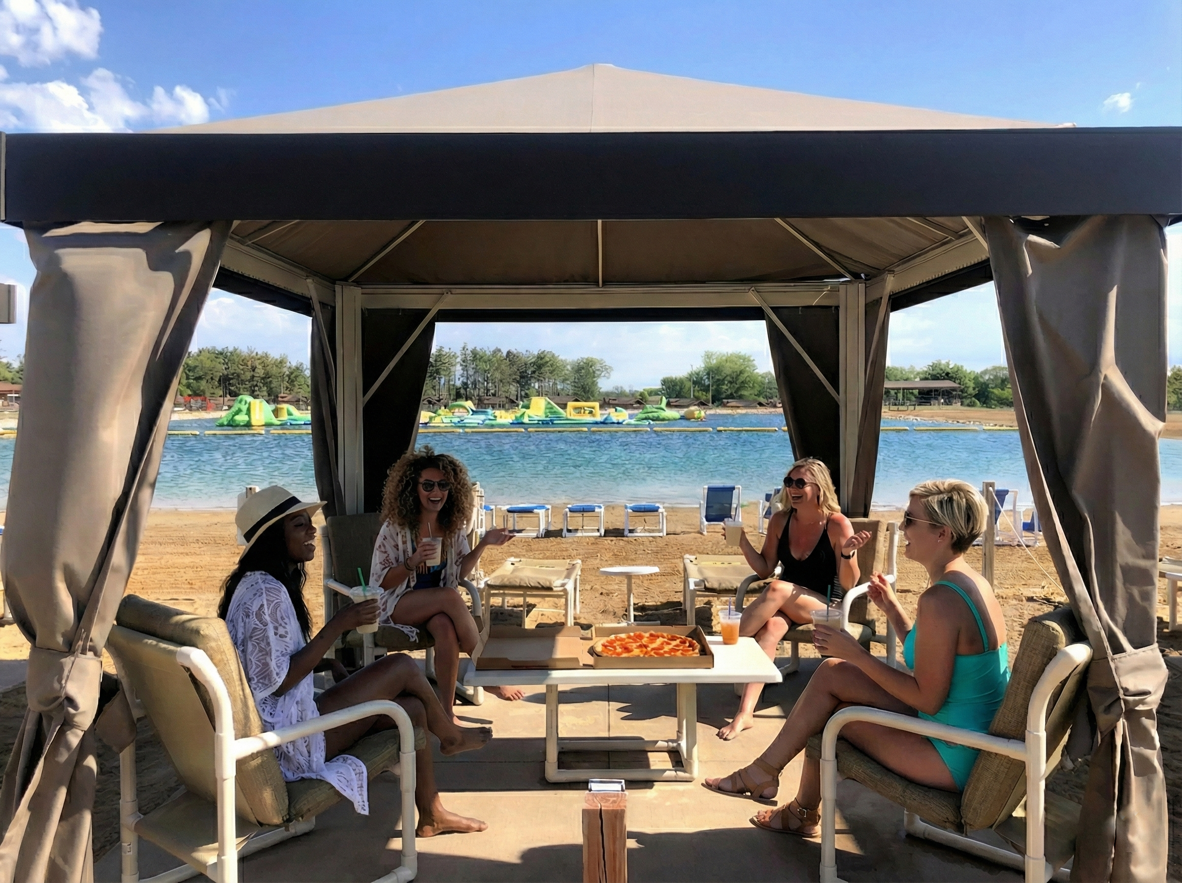 Take a dip, splash and play in our 3-acre manmade lake or relax on the sandy beach in your own private cabana.