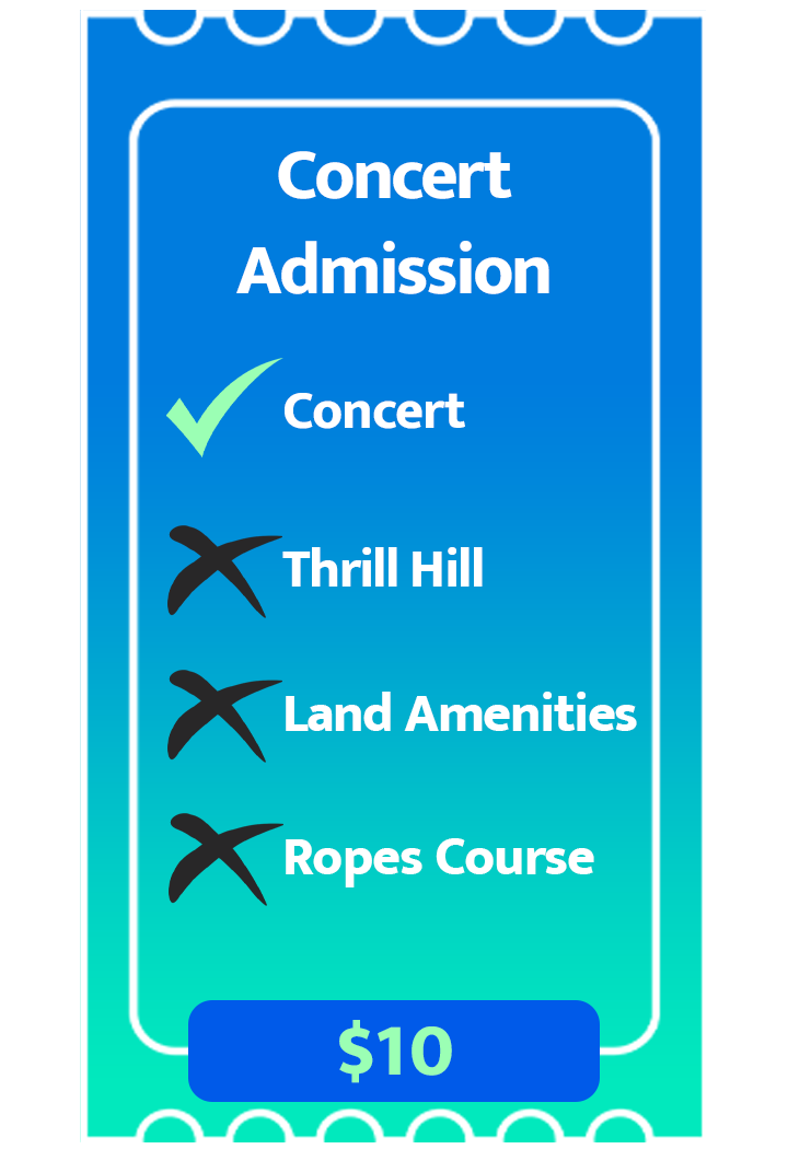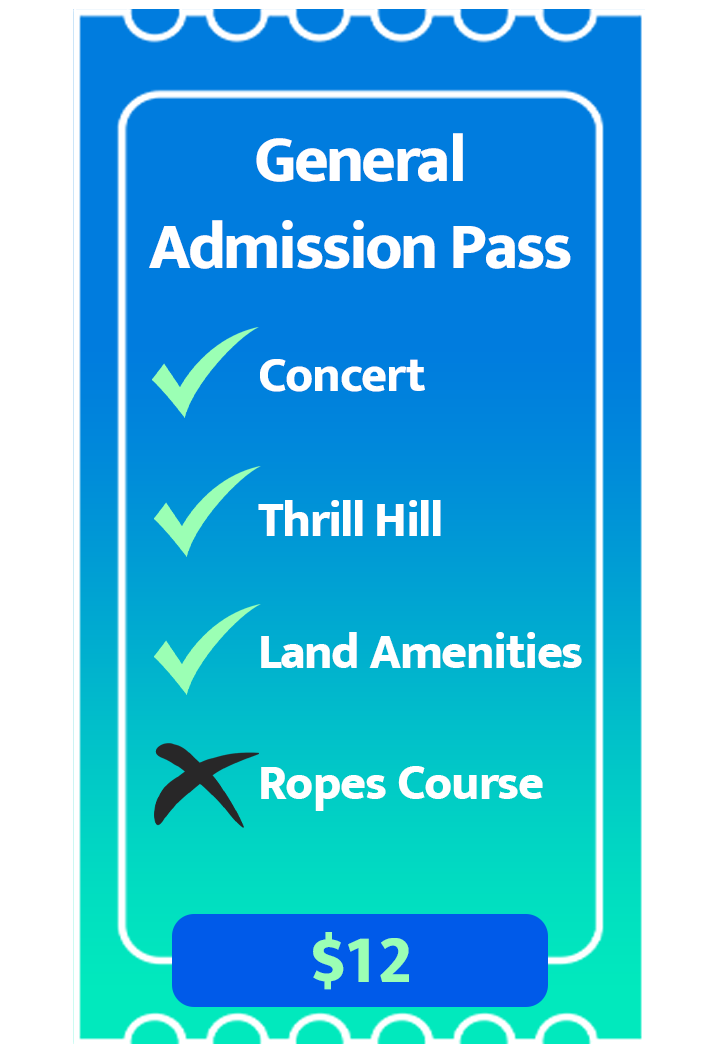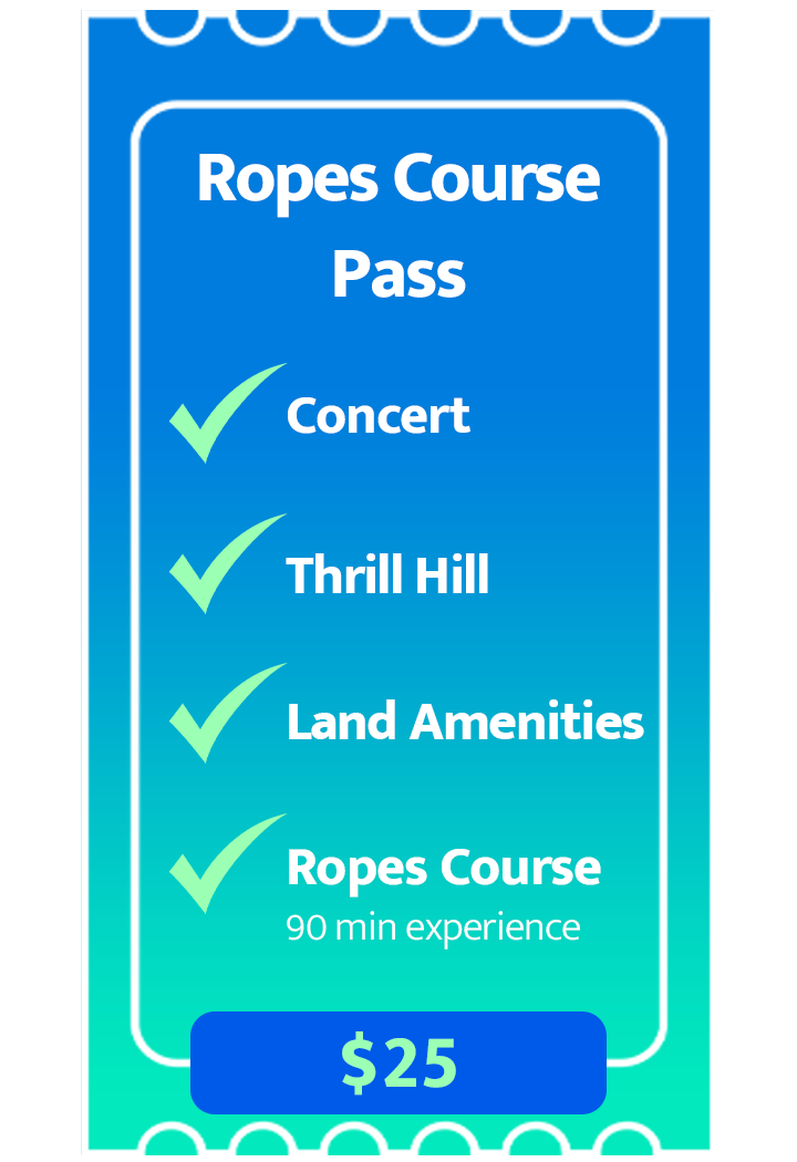 Bear Paw Adventure Park amenities are not included with general admission concert ticket. Amenity passes are available for purchase online or onsite at the Ticket Booth. Before purchasing amenity tickets, please read all of our height & age requirements.