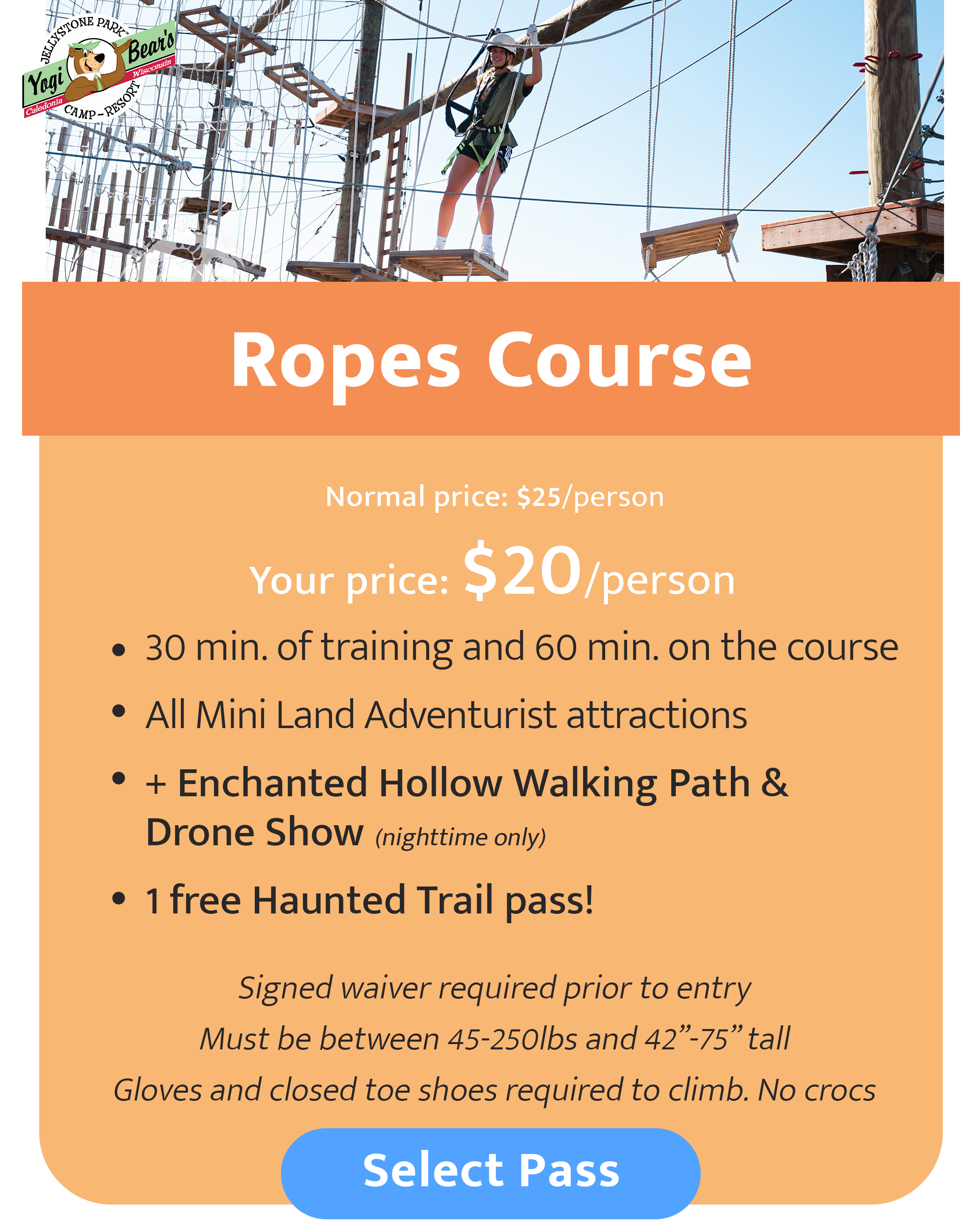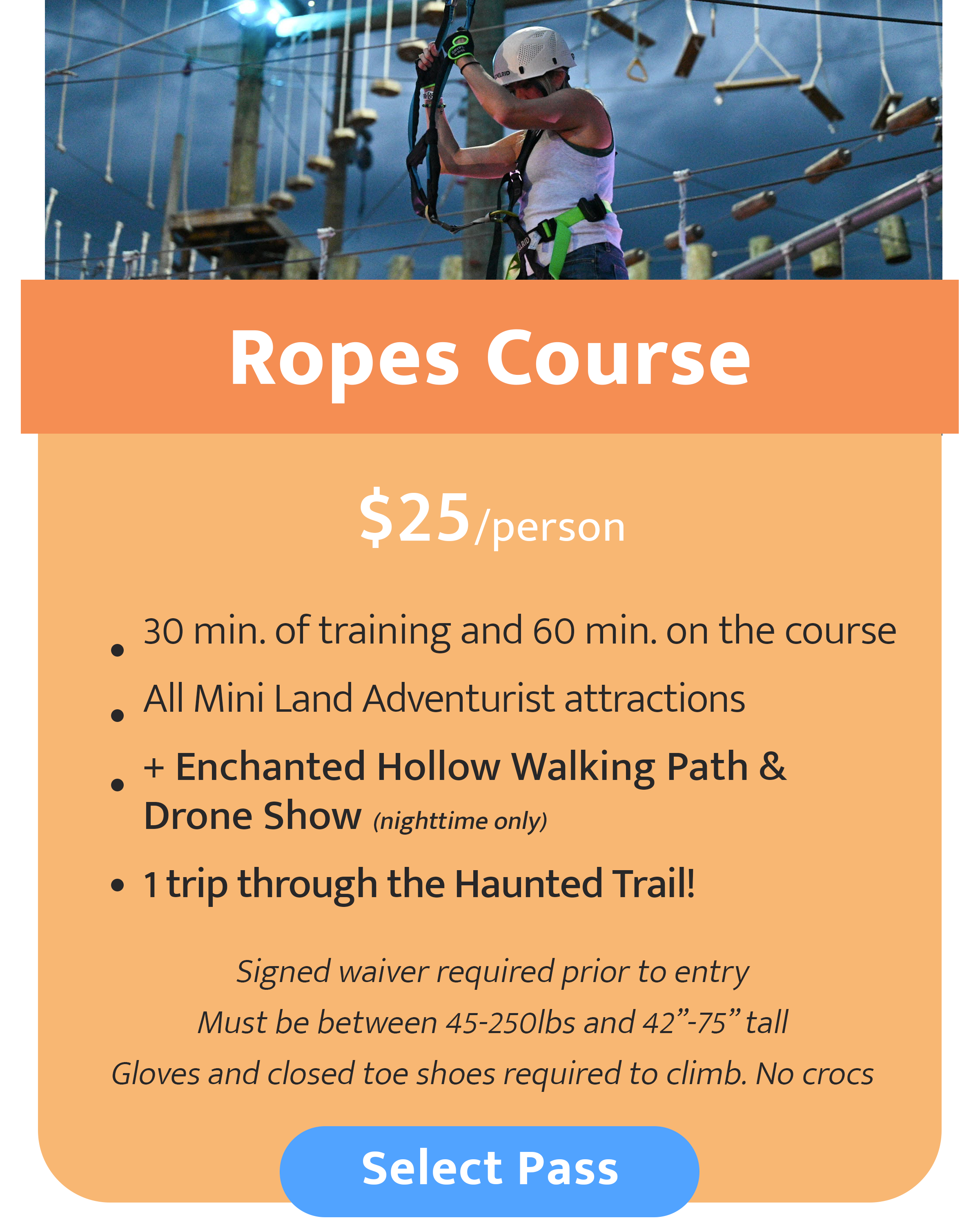 Guests do not reserve a specific session time for the ropes course. Instead, you’ll book the date you’d like to visit and enjoy one turn on the course at any time while it is open that day. Sessions begin every 30 minutes and may occasionally fill up. If your preferred session is full, you’ll be asked to wait for the next available time.