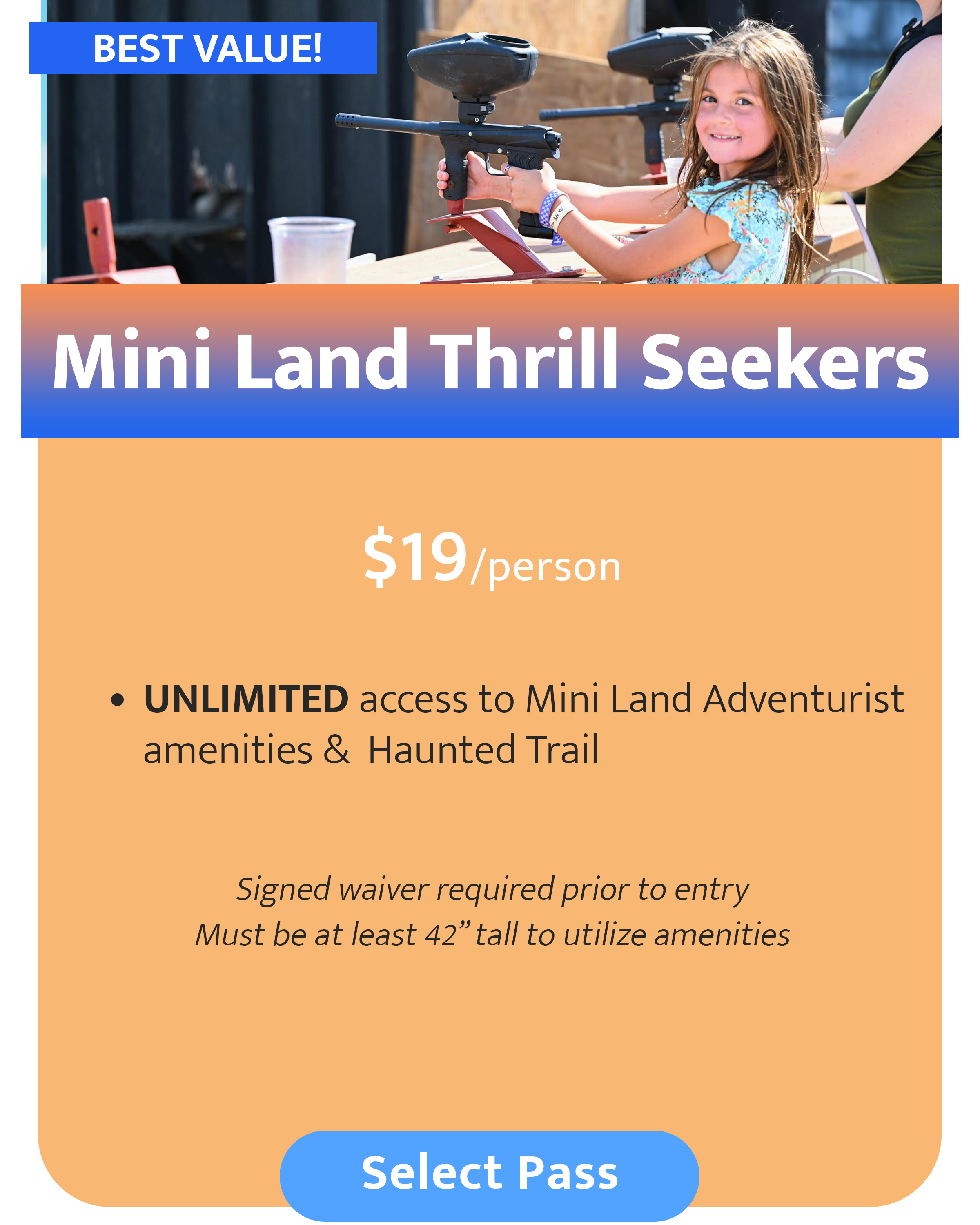 Guests under 42” receive free access to Mini Land Attractions. Height will be verified prior to entry. Free pass excludes: Spider Jump, Thrill Hill, Laser Tag, & Paint Ball