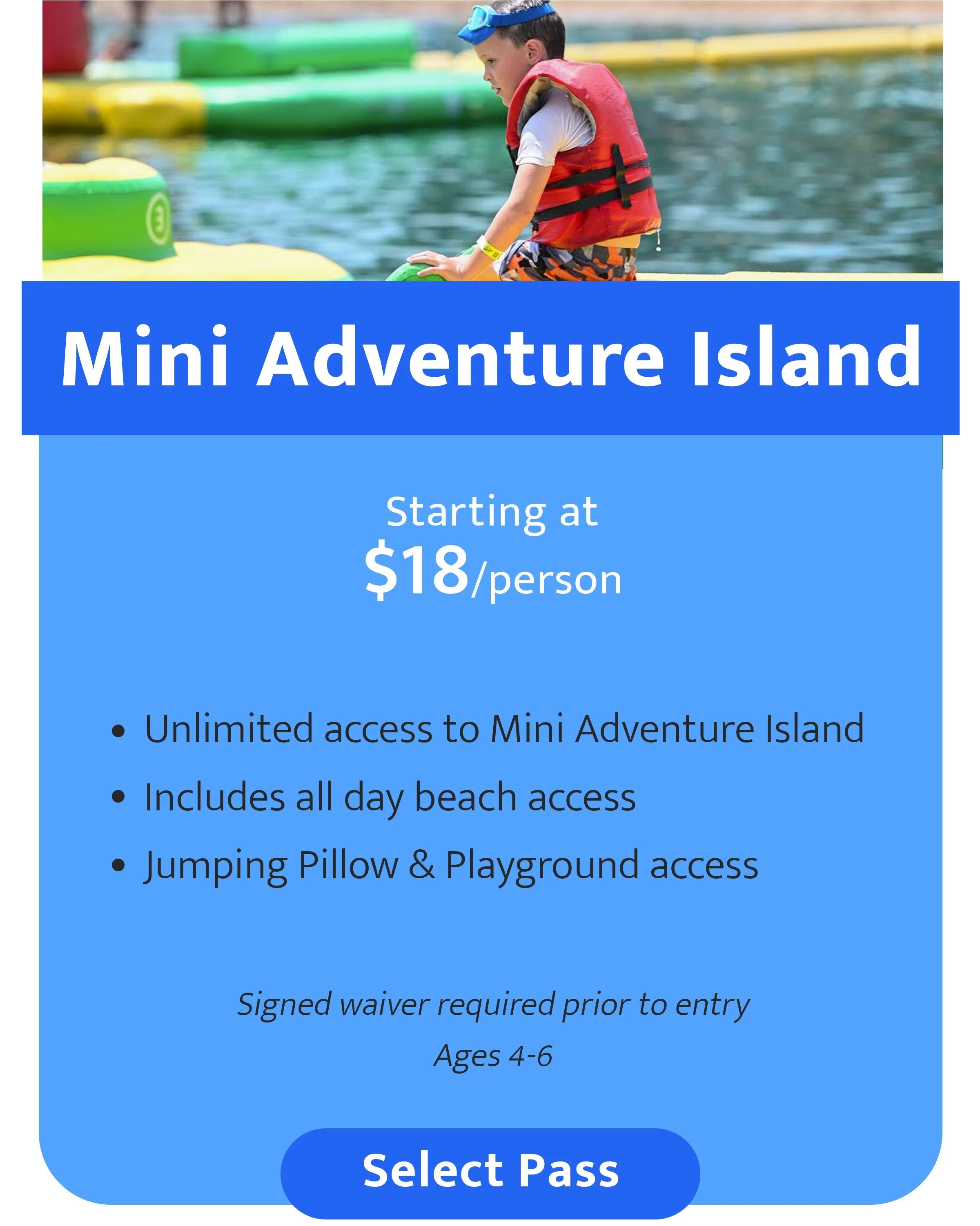 Water Adventures - To jump on Adventure Island, participants must be at least age is 6 years old and 42 inches tall. To jump on Mini Adventure Island, our new kids course, participants must be between ages 4-6 and be 39”-59” tall. A parent or guardian must be near their child using the course at all times. Adults are not permitted on the course.