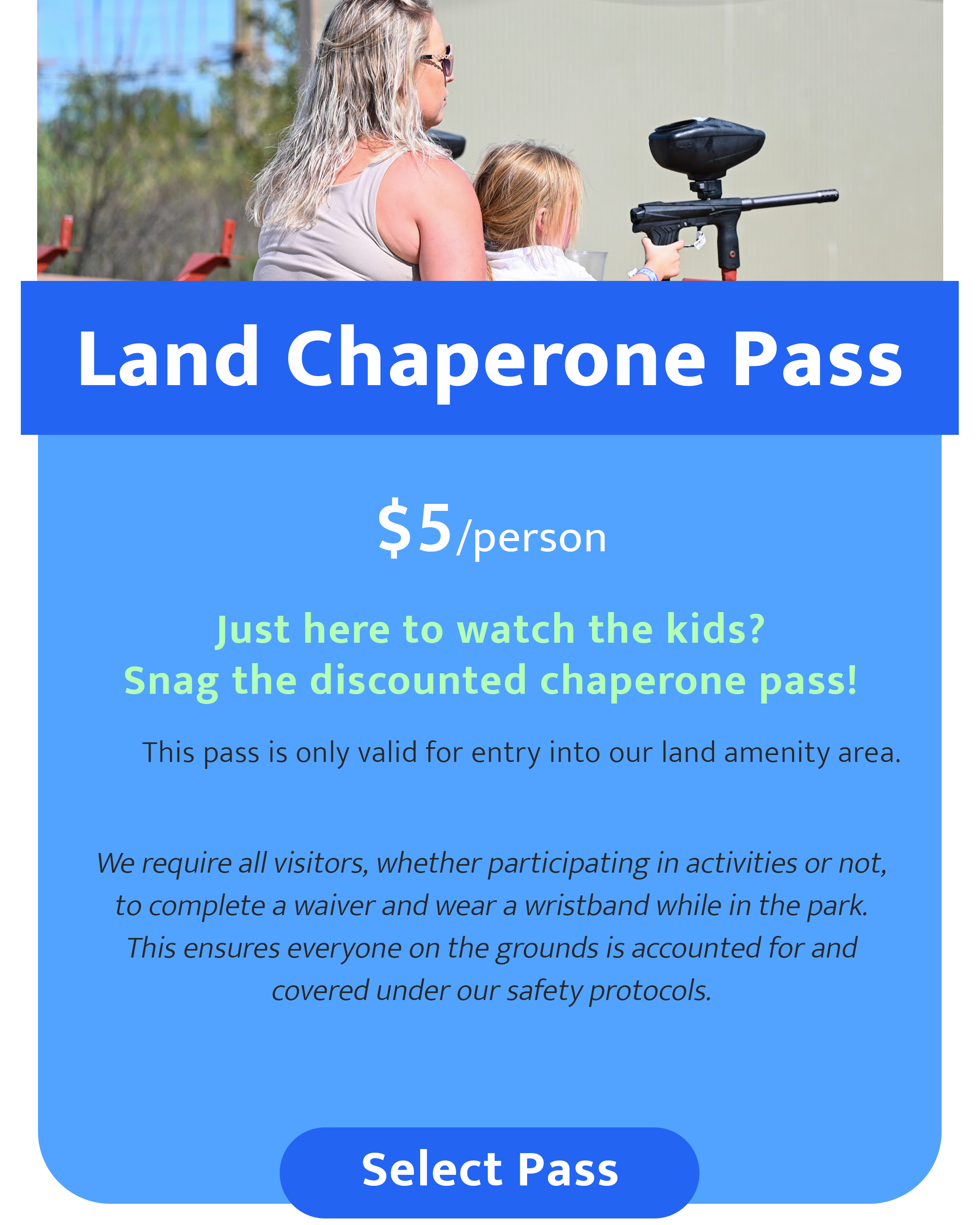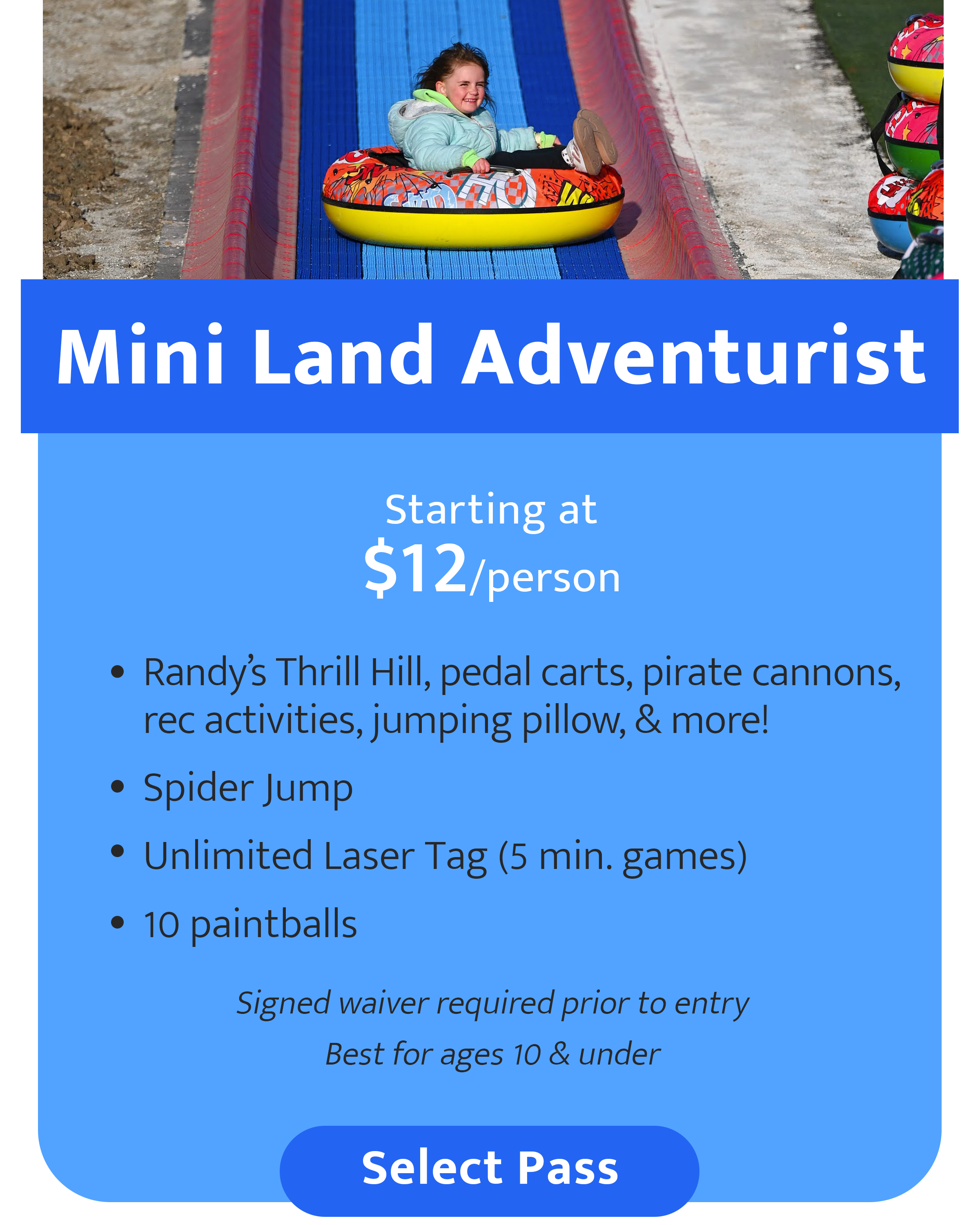 Note: Guests 42” and under receive free access to Mini Land Attractions. Height will be verified prior to entry. Free pass excludes: Spider Jump, Thrill Hill, Laser Tag, & Paint Ball. Gloves are required on the ropes course.